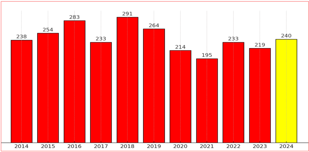 No ano seguinte ainda baixou mais para um valor inédito (195) abaixo dos 200. Contudo, estes foram anos anormalmente baixos em termos de nascimentos, por via do menor número de gravidezes concluídos como consequência da incerteza criada pela gestão da pandemia. Em 2022, o valor aumentaria para os 233, reduzindo para 219 no ano passado.