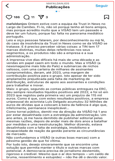 Se Mafalda Anjos não quis exercer esse direito ou até teve mas nada entende de demonstrações de resultados, deveria, em qualquer dos casos, ter batido com a porta logo no primeiro ano de liderança da Visão. Mas ela esteve como directora desta revista entre 2016 (antes ainda da chegada de Luís Delgado) e final de 2023. Foi publisher de todas as revistas do grupo de Luís Delgado entre Janeiro de 2018 e Dezembro de 2022. Só saiu de tudo quando o barco estava a afundar, mas tratou antes de conseguir para si um acordo de rescisão de 54 mil euros, tendo o karma lhe concedido, em troca, (mais) um calote do Luís Delgado.