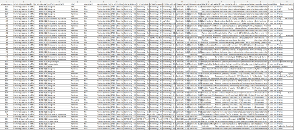 Numa análise detalhada à variável da evolução das reacções adversas – um processo moroso, porque o ficheiro do Infarmed lista o conjunto de afecções e sintomas numa mesma célula com indicações de progresso por vezes distintas –, observa-se que uma grande parte se refere a problemas que, em princípio, são ligeiros e corriqueiros, como dores no local de vacinação (quase quatro mil casos), dores de cabeça, febre ou dores (centenas de casos). Mas, de entre a lista, constam afecções gravíssimas potencialmente mortais ou com causadores de sequelas profundas. E isto altera de forma radical uma avaliação correcta da segurança das vacinas e impede, desse modo, acções judiciais com pedidos de indemnização.