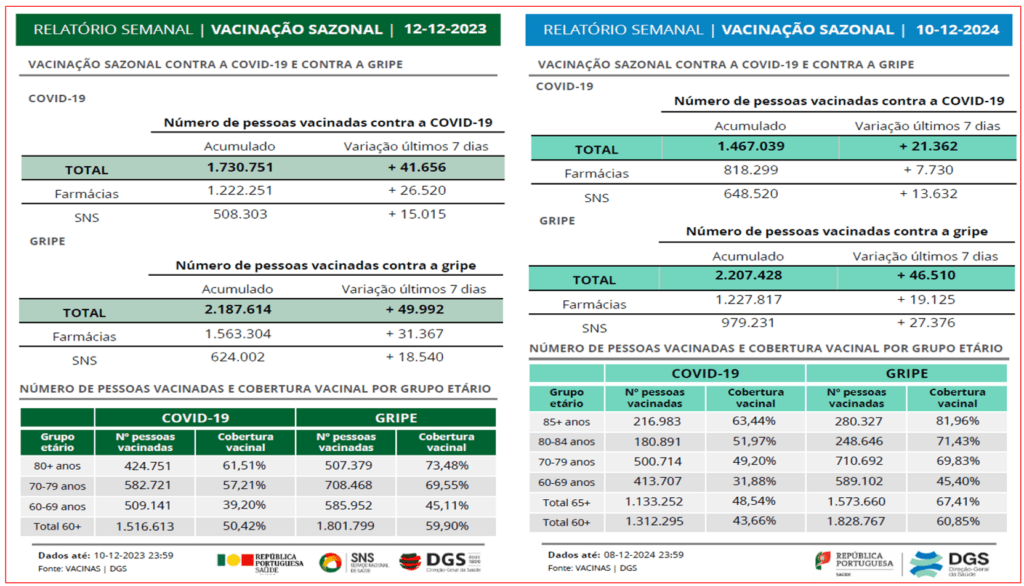 Ora, este ano, com informação recolhida pela DGS até 8 de Dezembro, o ‘abandono’ da vacina contra a covid-19 aumentou significativamente, não ocorrendo o mesmo para a vacina contra a gripe. De facto, os dados oficiais mostram que, para uma população com idade superior a 60 anos que se manteve estável, houve 1.828.767 pessoas que se vacinaram contra a gripe (mais 26.968 do que em 2023), mas apenas 1.312.295 que quiseram tomar a vacina contra a covid-19, ou seja, foram administradas menos 204.318 doses, o que representa uma queda de quase 14% face a 2023.