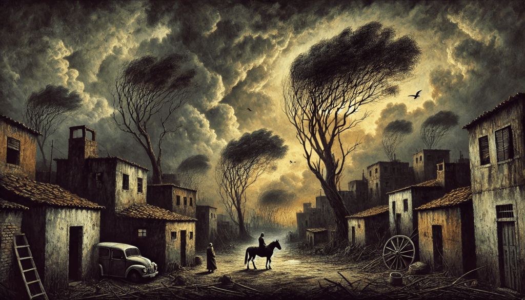 Num dia qualquer, os eucaliptos, os plátanos, os umbus e as figueiras voltam a sacudir suas cabeleiras molhadas. É sinal de que as nuvens negras se foram na direção do mar distante. Os homens abrem as portas enferrujadas de suas casas e espicham os ouvidos pelas vielas desta cidade que se chama Tapera, palavra que quer dizer campo arrasado, bandeira aviltada, barco à deriva…