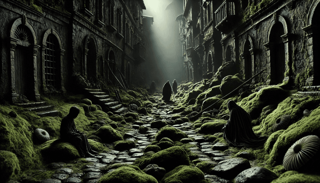 Da umidade virão o mofo e o musgo, cinza e verde. Nascerão em todas as coisas, especialmente sobre as pedras polidas do calçamento destas ruas abertas sobre a pestilência de antigos mangues. O verde veludo é o musgo. O traço cinzento é o mofo. O musgo costura estas ruas, umas nas outras, para que não se dissolvam sob os passos de todos esses enfeitiçados. O musgo veda as rachaduras das paredes descascadas para que espíritos sem paz não adentrem a sonolência dos nossos lares.