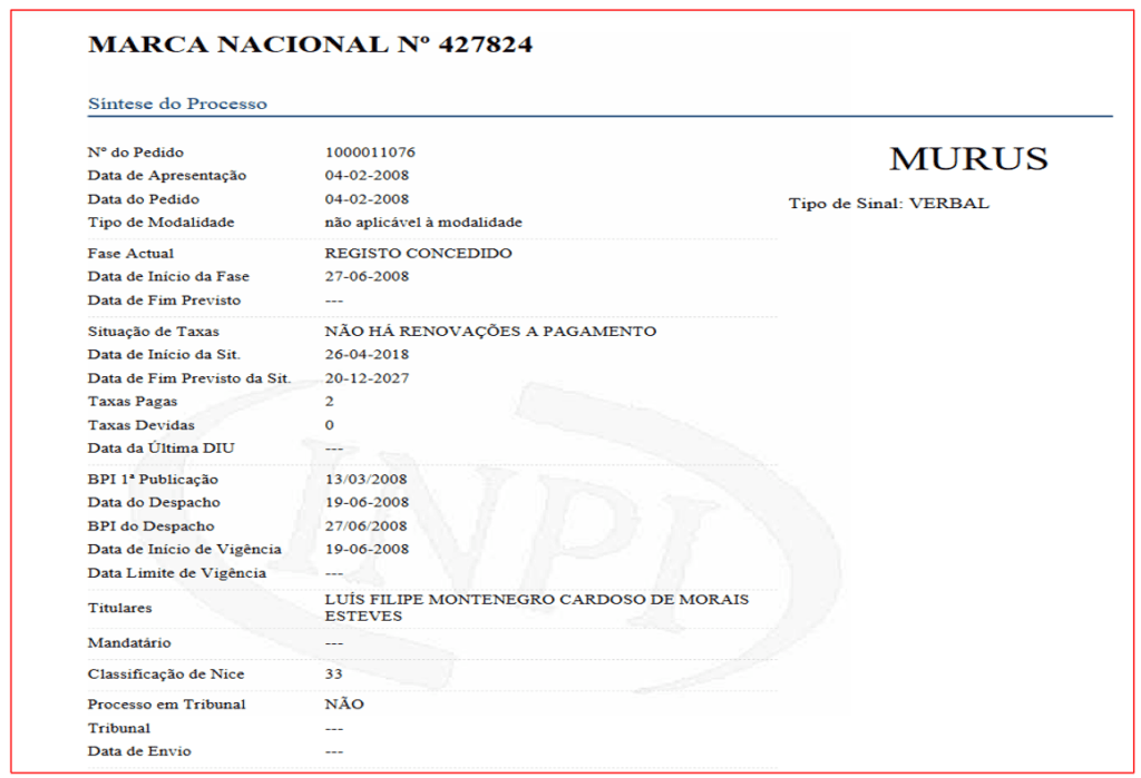 Ora, Luís Montenegro é, desde Agosto de 2023, detentor da marca Murus, registada no Instituto Português de Propriedade Industrial, sob a classe 33 da Classificação de Nice, que inclui bebidas alcoólicas, excepto cervejas. No entanto, no registo consultado pelo PÁGINA UM é indicado expressamente que a Murus é uma marca de vinhos. ↓