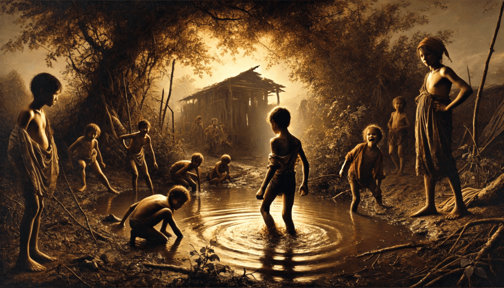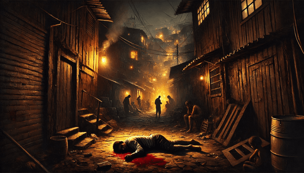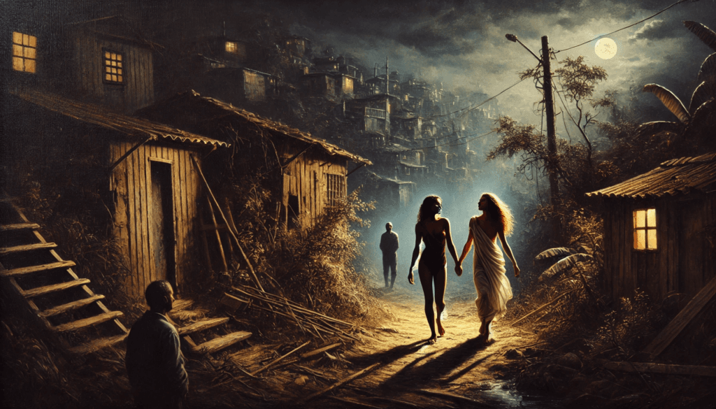 O Negãozinho bateu na porta do barraco. Quando a mãe da Marianita abriu a porta, de vela na mão, o Negãozinho mandou um soco nos queixos da mulher. Entrou no barraco, pegou a Marianita assim, na gravata, e se veio. Um dos guris correu de atrás, o menorzinho. O Negãozinho deu-lhe um pontapé que o coitadinho levantou no ar e depois caiu deitado.