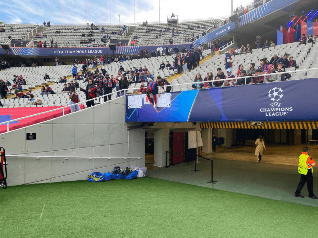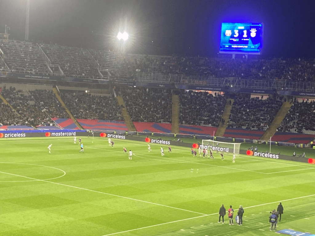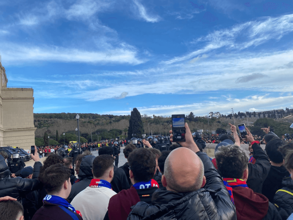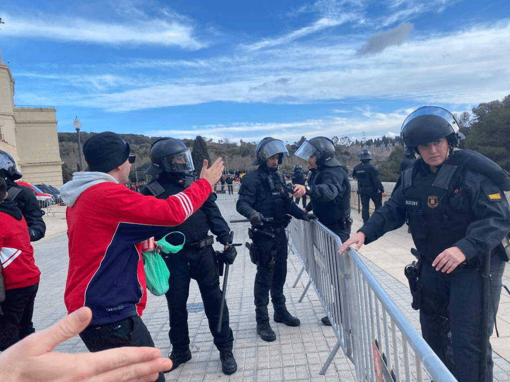 (E começa o jogo; tive de contornar o cordão de adeptos benfiquistas, ladeados por duras colunas de guardas pretorianos da polícia de choque, e lá me enfiei estádio adentro, não sem dificuldade de encontrar o meu lugar; em todo o caso, encontrei o Lucas, o brasileiro que, no Barcelona, se dedica a escrever sobre as façanhas do Raphinha.)