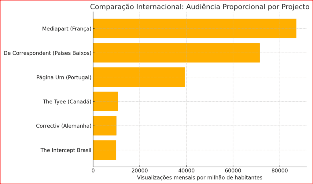 Com cerca de 405 mil visualizações mensais entre Outubro do ano passado e o presente mês de Março, e dirigido sobretudo para uma população de pouco mais de 10 milhões de habitantes, o PÁGINA UM regista actualmente perto de 39 mil visualizações mensais por milhão de habitantes. Esta métrica, usada para comparar proporcionalmente o alcance dos meios em diferentes países, coloca o PÁGINA UM num patamar assinalável quando confrontado com projectos de jornalismo independente internacionais bem financiados e amplamente estruturados.