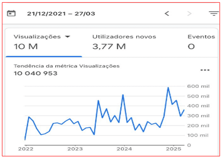 Mais relevante do que o total acumulado, que esta semana alcançámos, é o que os últimos meses revelam: nos últimos seis meses, o PÁGINA UM aproximou-se das 2,5 milhões de visualizações, o que traduz uma média mensal superior a 405 mil — um crescimento consolidado que não resulta de campanhas, virais ou algoritmos comprados, mas da força das notícias e da vasta panóplia de conteúdo e sobretudo da fidelidade dos leitores. ↓