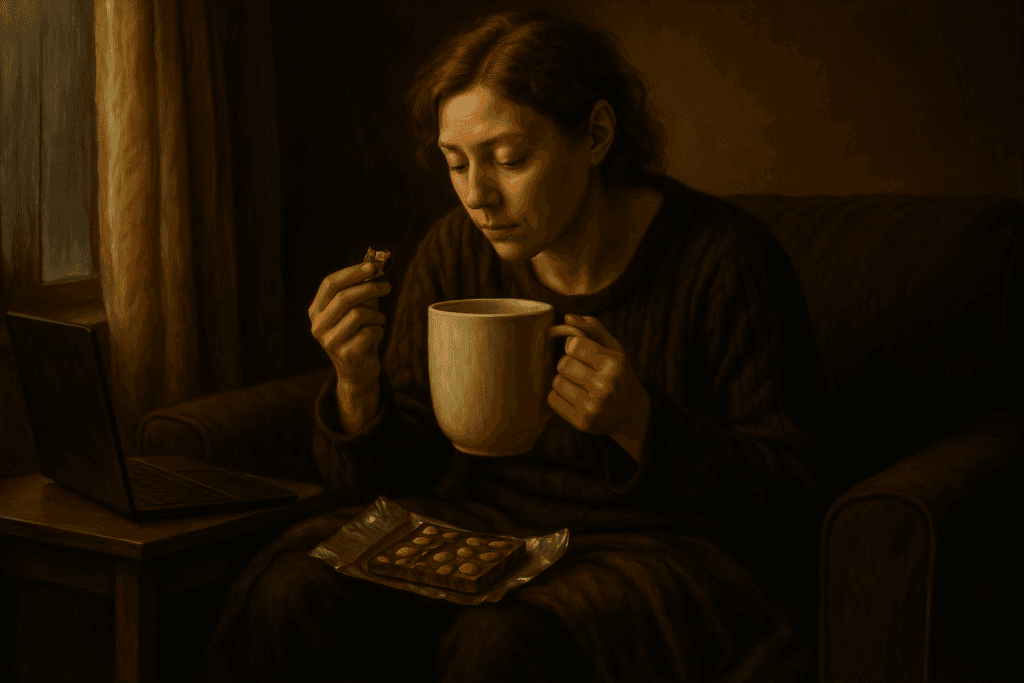 Está um dia que muitos achariam mau: cinzento, chuvoso, frio… Para mim é perfeito. A casa vazia, uma caneca de café XXL, uma tablete de chocolate com amêndoas — 553 calorias por 100 gramas — terá de pagar o mal que faz com o bem que sabe —, e um audiolivro, porque a moleza é tanta que nem dá para virar páginas.