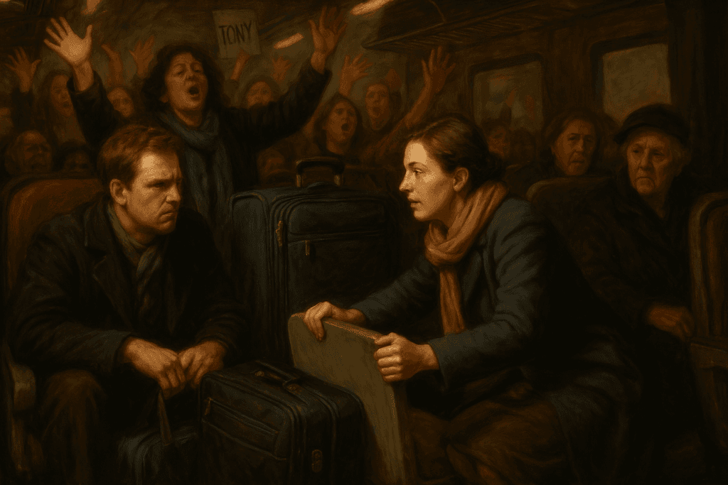 Sinto-me a pior amiga do mundo. Como pude sequer pensar em não ir? Levanto-me, arranjo-me e dirijo-me à estação. Aos domingos, o comboio costuma ir vazio. Hoje, não. Há uma multidão a aguardar, e já vem cheio. Percorro a carruagem em que entrei, depois a seguinte e, finalmente, avisto um lugar vago. Um passageiro colocou uma mala de viagem e uma mochila no banco. Aproximo-me, na expectativa de que desvie os pertences. Olha para mim, eu para ele… e nada. Avanço mais um pouco. Voltamos a encarar-nos, mas, desta vez, tem no rosto uma expressão de desagrado. Digo-lhe: ↓