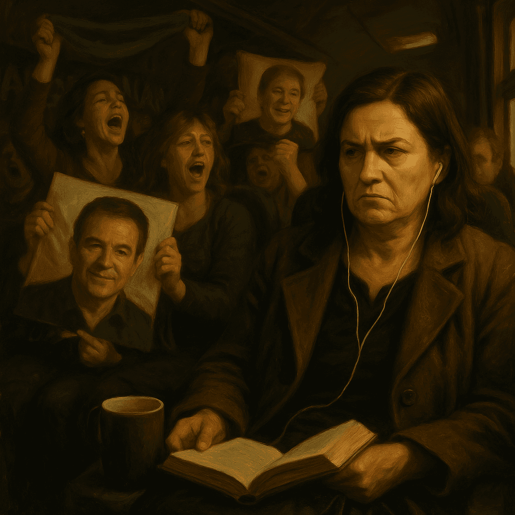 Acomodada no meu lugar, coloco os auscultadores e continuo a ouvir a leitura, entretanto interrompida. Procuro relaxar e concentrar-me, mas sem sucesso. Há um barulho e uma movimentação fora do comum nestas viagens. Os passageiros, maioritariamente mulheres de meia-idade, agitam os braços no ar de modo sincronizado e cantam. Fico curiosa. Retiro um auricular: cantigas de amor, daquelas em que “coração” rima com “canção” e que se entoam revirando os olhos. O volume aumenta, no que é claramente uma competição para mostrar quem sabe melhor as letras, quem é a maior fã, a verdadeira. A excitação está ao rubro. Erguem-se cartazes, cachecóis, camisolas, almofadas com o rosto do ídolo, fotografias tiradas ao seu lado.