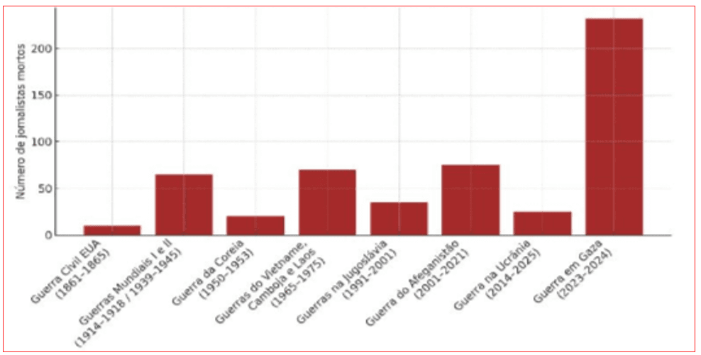 Com efeito, na Ucrânia estão, por agora, contabilizados 29 jornalistas mortos, incluindo o período da guerra no Dombass iniciada em 2014. As duas décadas de guerra no Afeganistão, entre 2001 e 2021, causaram cerca de sete dezenas de mortes, embora os números reais sejam incertos. As guerras resultantes do desmembramento da Jugoslávia também causaram largas dezenas de vítimas entre a imprensa, mas também muito aquém dos valores atrozes de Gaza. E mesmo conflitos de dimensão territorial vasta tiveram menos vítimas. Por exemplo, a II Guerra Mundial causou a morte a 67 jornalistas, enquanto as guerras do Vietname, Cambia e Laos provocaram a morte de 71 jornalistas estrangeiros e locais.