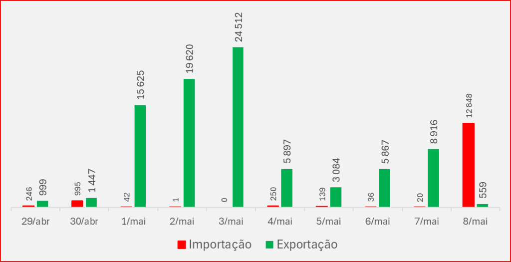Mas esta “normalização” — que esteve na origem de cerca de dez horas de apagão — levanta uma questão cada vez mais difícil de ignorar: se o sistema eléctrico nacional conseguiu manter-se durante nove dias completamente independente de importações de Espanha, entre 29 de Abril e 7 de Maio, qual foi afinal a necessidade de estar a importar 8.000 MW de potência instantânea no momento do apagão do dia 28 de Abril? Além disso, não se pode sequer afirmar que Portugal estivesse à míngua de electricidade. Também segundo dados da Red Eléctrica de España, durante os últimos nove dias, Portugal ajudou o sistema eléctrico espanhol a estabilizar, através da exportação regular de electricidade. ↓