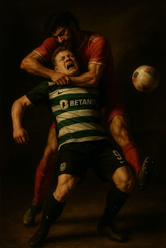 Quando o ovo estrelado lhe rebentou no prato, ao comer uma alheira de frango por causa da dieta, o treinador Rui Borges teve um estranho pressentimento sobre o jogo com o Gil Vicente. Sem Ousmane Diomande, castigado por preconceito religioso do Conselho de Disciplina, teria de colocar no centro da defesa o holandês com nome de Santo Justo. Em tempos de comoção pela morte do Papa, poderia a equipa de arbitragem aproveitar as correrias dele, como na final da Taça do ano passado, para pilhar galinhas em terra relvada, a fim de animar a prima delas que se exibe pelos ares no Estádio da Luz em troca de uma ração de minhocas. ↓