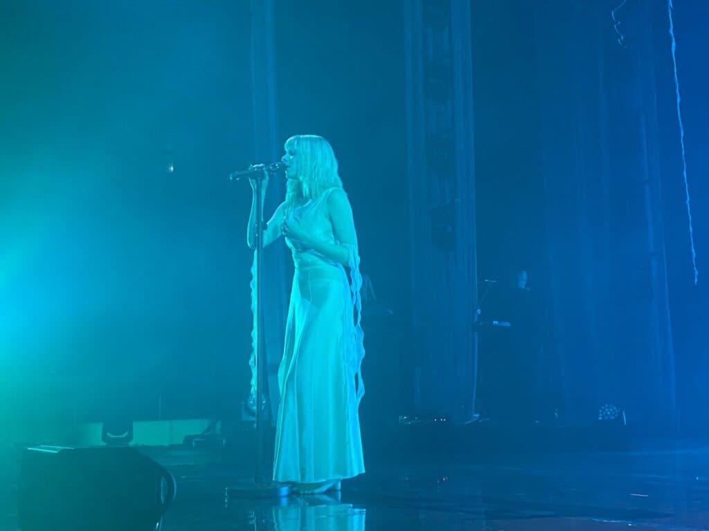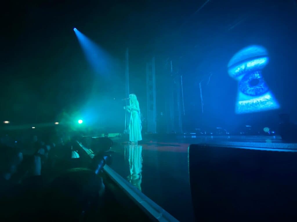 E que voz! O timbre de Aurora, ao vivo, surpreende — sobretudo porque consegue algo que raramente se mantém na transição entre estúdio e palco: uma verdade vocal que não vacila. Ouvindo-a em disco, dir-se-ia tratar-se de mais uma voz bem produzida por software, encaixada num dream pop estilizado e polido. Mas bastam poucos segundos em palco para que essa impressão ceda lugar a algo mais raro: autenticidade vocal, domínio técnico e, sobretudo, uma capacidade de encarnar a canção, como se cada verso fosse, simultaneamente, lamento, encantamento e exorcismo.