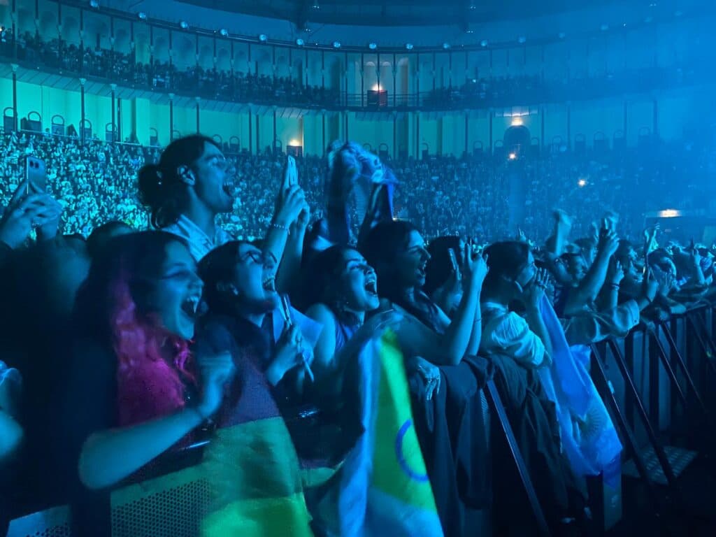 Desde o primeiro instante, com gestos que pareciam mais exorcismo do que coreografia, a norueguesa nascida em 1996 emergia, para os mais veteranos, como uma figura trans-histórica. Para quem viveu os anos oitenta e noventa, o espanto era redobrado: ali estavam todas as deusas fundidas numa só — a fragilidade orgânica de Kate Bush, o lirismo dilacerado de Sinéad O’Connor, o sussurro tribal de Enya, a excentricidade encantada de Björk, a espiritualidade de Loreena McKennitt, a braveza poética de Annie Lennox. E também David Bowie, pela sua plasticidade camaleónica, aqui já bem evidente quando canta Life on Mars (que não incluiu no Campo Pequeno). Mas tudo isso transfigurado, não por imitação, mas por reinvenção. Aurora é a sua própria linhagem. ↓
