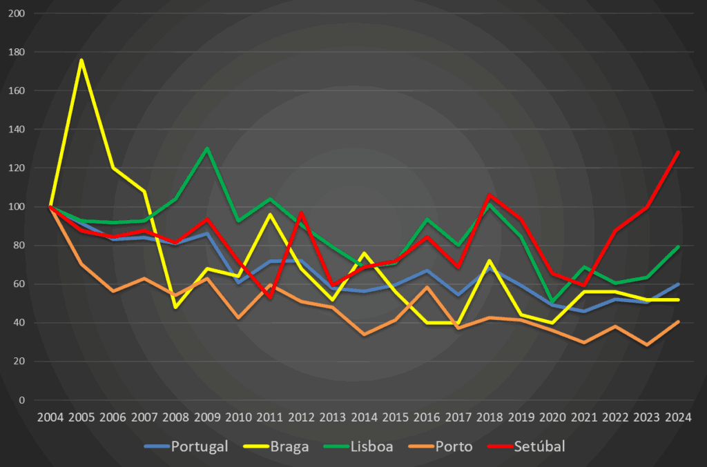 De acordo com os dados do INE, em 2004 registaram-se no distrito de Setúbal um total de 32 óbitos, menos nove do que em 2024. Ou seja, esta região teve um crescimento da mortalidade de 28% durante este período, em absoluto contraciclo com todas as outras regiões de Portugal. De facto, não há nenhum caso similar — muito pelo contrário.
