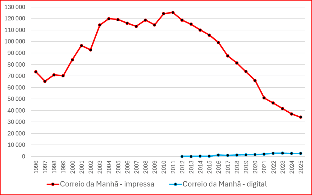 Desde 2011 não há ano em que o Correio da Manhã tenha conseguido inverter a tendência de queda. No auge de 2011, vendeu 125.354 exemplares diários – ou seja, mais de 3,75 milhões por mês; cinco anos depois já estava abaixo da fasquia dos 100 mil por dia, mesmo assim cerca de três vezes mais do que os valores do primeiro trimestre de 2025. Ou seja, em 14 anos, entre 2011 e 2025, o Correio da Manhã teve uma quebra de vendas de 73%, que nem sequer é mitigada pelas assinaturas digitais, que começaram em 2012 e apenas rondam agora os 2.700.