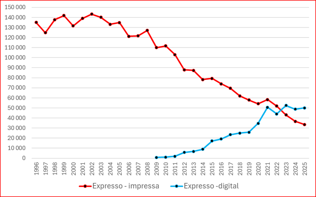 Nos anos seguintes, o Expresso deixou de ser um semanário com uma edição online para se tornar num diário digital com uma edição semanal em papel. Esta nova versão teve duas consequências: quebras brutais em banca, sobretudo a partir de 2021, que fazem com que por edição se tenham vendido apenas 33.603 exemplares durante o mais recente trimestre; e um aumento nas assinaturas pagas, rondando agora as 50 mil. Dir-se-ia que, somando ambas as categorias, se teria mais de 80 mil leitores, mas esse número fica aquém dos valores da edição semanal da primeira década do presente século.