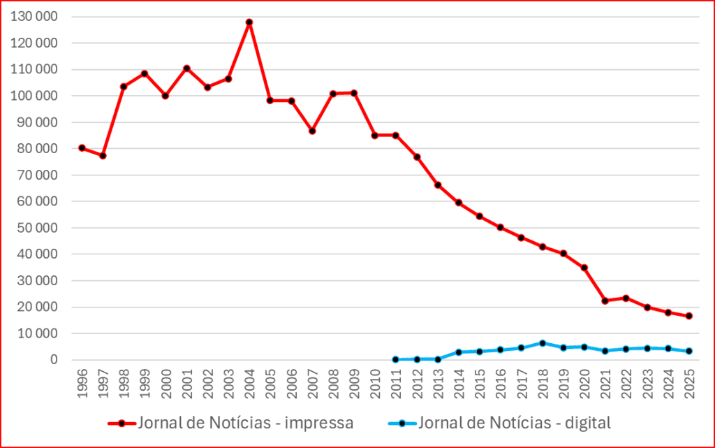 Ainda por cima, a digitalização, longe de salvar o navio, apenas está a apressar o naufrágio: 3.300 assinaturas digitais pagas em 2025. Com uma assinatura anual a custar 24,95 euros, não é por aqui que o JN se salvará.