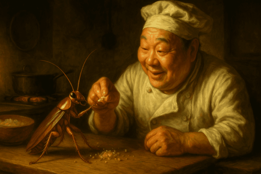 Aqui há tempos, mudei de casa. Agora moro na casa de um senhor chinês. É cozinheiro e está sempre a dar-me petiscos. Eu ponho-me de patas no ar e ele mete-me pedacinhos na boca. O meu petisco favorito é pão ralado. Hum…