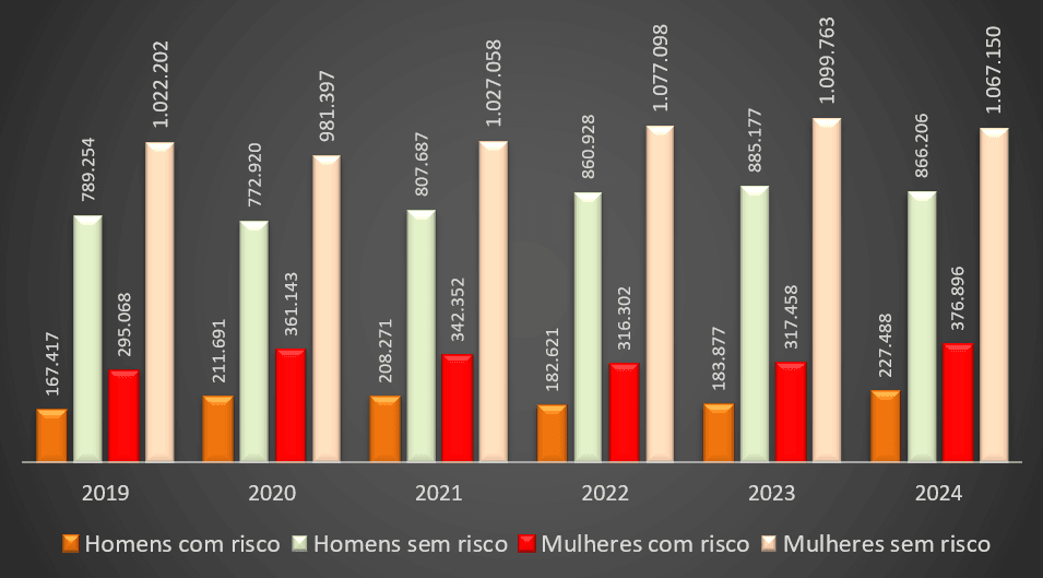 A situação torna-se ainda mais grave quando analisada sob o prisma do sexo. Entre os homens com mais de 65 anos, o risco de pobreza em 2024 afectava 20,8%, valor já de si significativo. Mas entre as mulheres com a mesma idade, a percentagem ascende a 26,1%, o que equivale, segundo os cálculos do PÁGINA UM, a mais de 376 mil mulheres idosas em risco de pobreza ou exclusão social — um número que supera em muito os 227 mil homens idosos na mesma condição. A disparidade é estrutural: existe não apenas uma diferença de rendimentos ou protecção social, mas também uma assimetria demográfica.