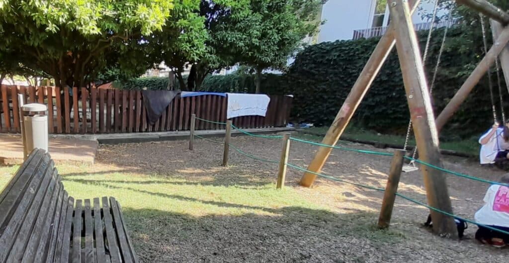Ao lado do escorrega maior, três tendas ocupam o espaço destinado a correrias e brincadeiras de crianças. A mesa redonda existente no parque infantil, outrora usada para piqueniques e festas de aniversário infantis, estava ocupada por três jovens de aparência hippie e descontraída a fumarem drogas ‘leves’. O cheiro similar a ‘haxixe’ sente-se em várias zonas do parque infantil.