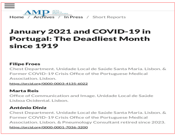 Sob o título “Janeiro de 2021 e a COVID-19 em Portugal: o mês mais mortal desde 1919”, o artigo pretende convencer-nos, numa sucessão de frases vagas e comparações grotescas, de que o impacto da pandemia em Portugal rivaliza com o da gripe espanhola, que teve o seu auge em 1919. A narrativa começa pela cronologia: 1.150 dias de pandemia, de Março de 2020 a Maio de 2023, 26.655 mortos atribuídos à COVID-19, com um pico de 5.805 óbitos em Janeiro de 2021. ↓