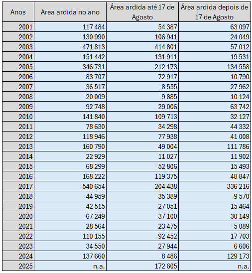 Em 2025, quando ainda se está em pleno mês de Agosto, a contabilidade dos incêndios já atingiu 172.065 hectares de área ardida, segundo dados do Instituto da Conservação da Natureza e das Florestas (ICNF), sendo o quarto pior do século, somente atrás de 2017, de 2003 (471.813 hectares) e de 2005 (346.731 hectares). Estes três anos vieram, aliás, colocar o patamar da destruição dos incêndios rurais num nível impensável no século XX, quando um “ano mau” significava valores ligeiramente acima de 100 mil hectares.