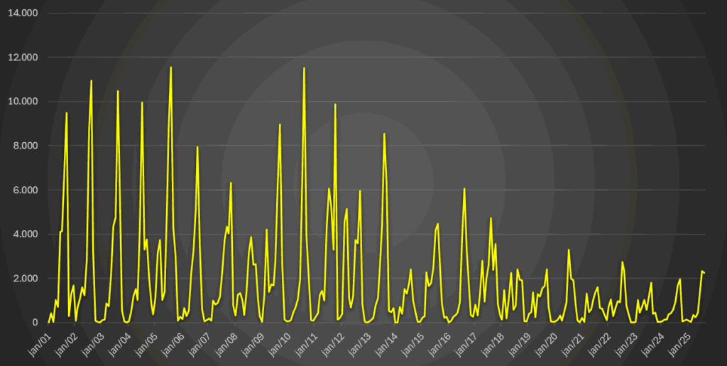 Este contraste entre o número relativamente baixo de ignições em Agosto de 2025, sobretudo em comparação com 2003 e 2005, e a dimensão catastrófica dos danos não pode ser explicado pela meteorologia ou pelo acaso. O PÁGINA UM analisou todos os registos mensais desde Janeiro de 2001 até ao presente, e a conclusão é inequívoca: a máquina de combate está em colapso, mesmo com uma tendência de redução de ignições, e Setembro do ano passado já foi o primeiro sinal.