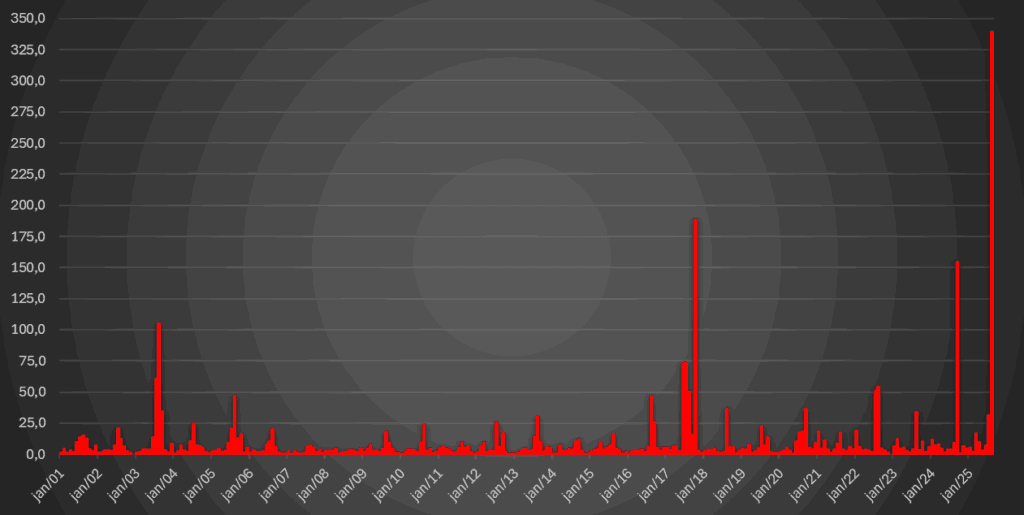 Se a última semana do mês em curso não piorar os valores, Agosto de 2025 ficará apenas aquém dos tristemente lendários meses de Agosto de 2003 (312 mil hectares) e de Outubro de 2017 (289 mil hectares), neste caso ardidos em pouco mais de 24 horas devido a fenómenos meteorológicos absolutamente atípicos. ↓