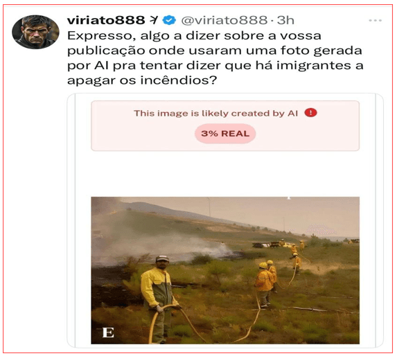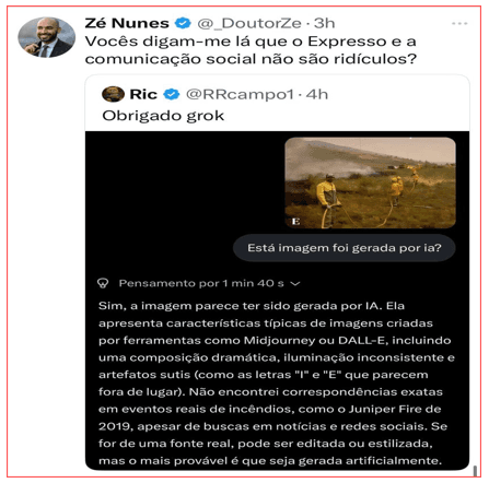 Seriam fotografias ilustrativas de equipas de sapadores? Eram, afinal, imagens autênticas ou fruto das manipulações correntes em tempos de inteligência artificial? Foi o que muitos começaram a questionar nas redes sociais — e até um deputado do Chega, Rui Paulo Sousa, aproveitou para lançar suspeitas sobre a veracidade da reportagem. Ao longo do dia de ontem, a rede social X inundou-se de publicações a pôr em causa a autenticidade das fotos – e, por arrasto, da própria reportagem –, não faltando análises sobre a probabilidade de recurso a inteligência artificial que a classificavam como altamente suspeita.