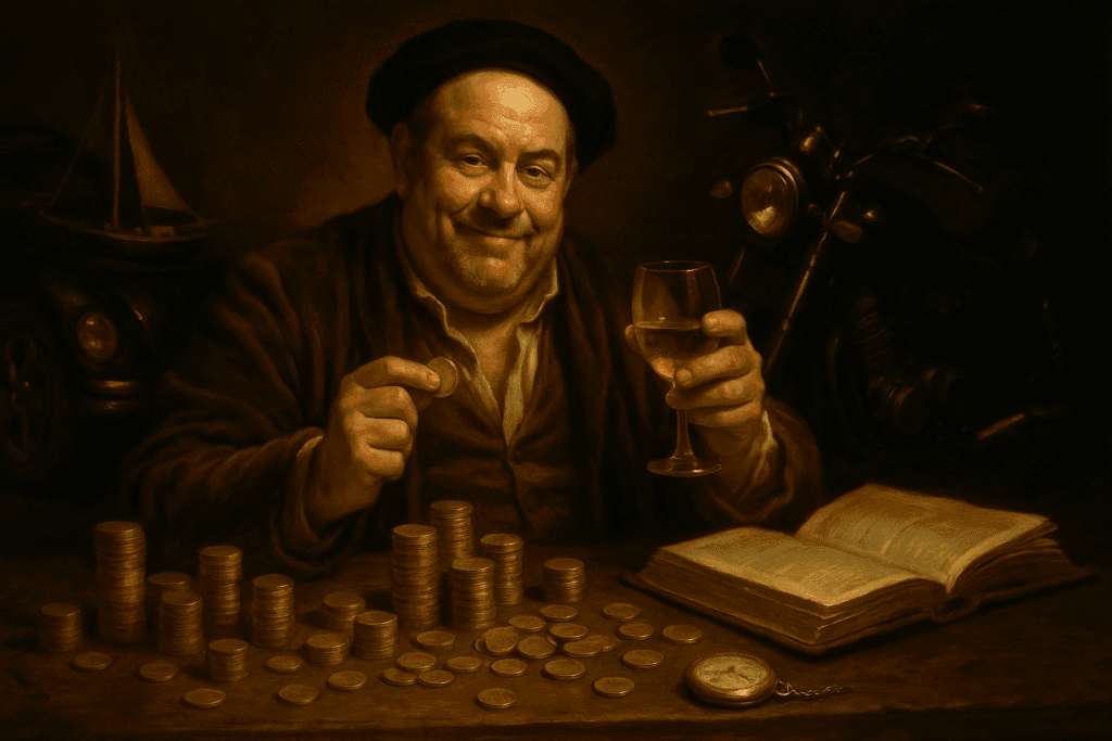 Fortunato nunca duvidara de si próprio. Sabia que tinha nascido para ser rico. Era uma vocação. Um talento que a falta de liquidez o impedia de demonstrar. Chegara a sua oportunidade. Multiplicaram-se os brinquedos – carros desportivos, motas de alta cilindrada, barcos, relógios extravagantes – almoços demorados, jantares principescos regados com vinhos escolhidos a dedo. A mesa cresceu. A cada dia surgiam novos amigos. Pessoas que finalmente tinham tido a oportunidade de perceber o seu requinte, os seus atributos ofuscados pela falta de recursos. Não havia médico, advogado, juiz ou comerciante de prestígio que ousasse faltar: todos corriam a sentar-se à mesa do ilustre anfitrião. ↓