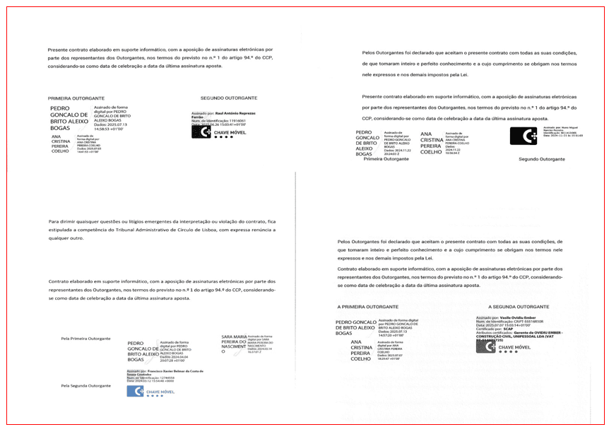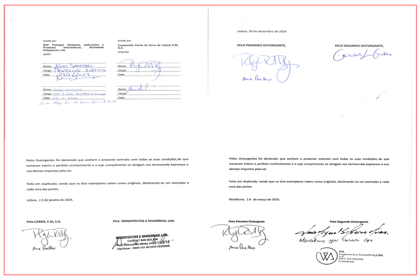 Ora, numa parte considerável dos contratos da Carris desde 2024 disponíveis no Portal Base, os administradores utilizam assinatura digital com timestamp, de modo a confirmar, sem possibilidade de adulteração, o dia e a hora da assinatura. Em outros casos, em menor número, quando os contratos são assinados a caneta, nunca são colocadas tarjas pretas. ↓