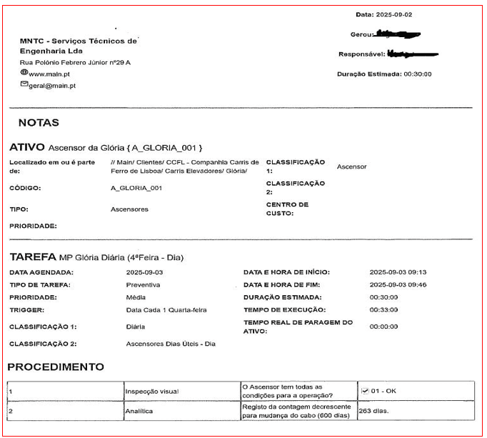Esta parte merece letras garrafais: “TEMPO REAL DE PARAGEM DO ACTIVO: 00:00:00.” Verificar “na fossa” uma “viagem completa” e, simultaneamente, não registar qualquer paragem operacional levanta dúvidas práticas (e de segurança do próprio técnico). Mais: sem imobilização não há testes de emergência, não há estabilização para medições, não há desmontagens mínimas. ↓