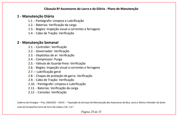 No caso da Glória (e também do Lavra), o caderno de encargos limita-se a exigir uma “verificação” dos cabos, sem qualquer norma técnica específica, periodicidade diferenciada ou referência a métodos de ensaio. Ou seja, se já se sabe que a inspecção diária era apenas visual, como demonstram os registos entregues pela Carris, nenhuma exigência existia para que as outras inspecções com periodicidade semanal, mensal e semestral fossem diferentes. Fica, porém, por esclarecer se a empresa responsável pela manutenção — a MNTC — complementava essas verificações com algum tipo de ensaio mais aprofundado, uma vez que o contrato não o exigia expressamente. ↓
