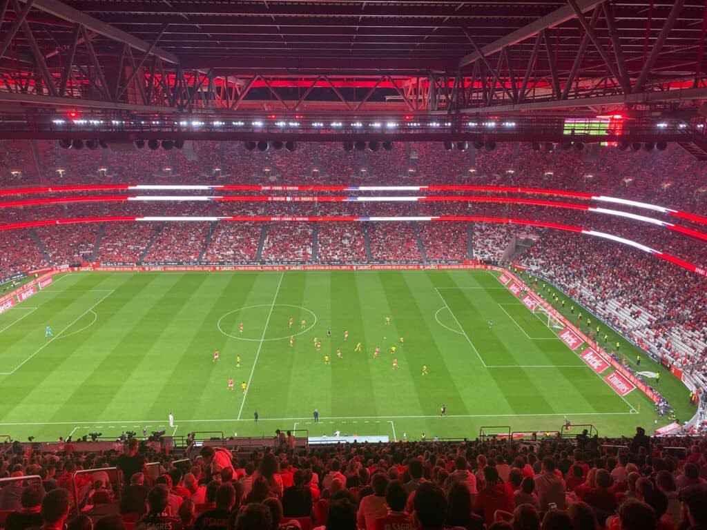 Entre o som do público e o rumor de fundo das teclas, falei com a Elisabete e lá fomos redigindo o artigo, a meias — eu sentado na Varanda da Luz, com o portátil perto do famoso farnel do Benfica, metendo de vez em quando um olho no relvado, outro no ecrã, e um terceiro (imaginário) no relógio.