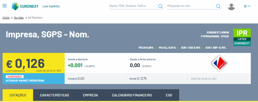 Actualização: CMVM e Euronext suspendem negociação das acções da Impresa
