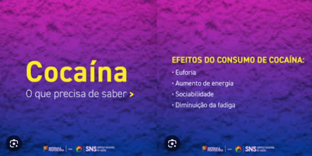 Já na campanha de informação relativa ao uso de cocaína, publicada no dia 10 de Outubro, o SNS destacava que os efeitos do consumo da droga incluem: euforia; aumento de energia; sociabilidade; e diminuição da fadiga. Este slide em particular está a ser partilhado nas redes sociais, separado dos restantes slides, para criticar o SNS pelo conteúdo da campanha de sensibilização.