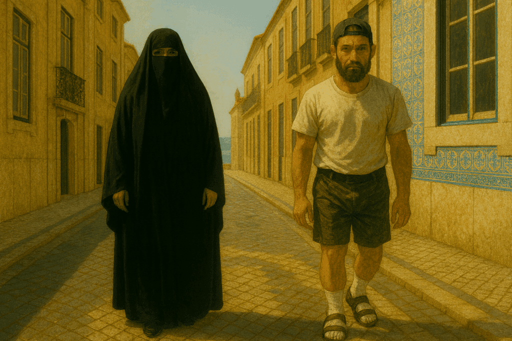 Dir-me-ão, elegantes leitoras e cavalheiros aprumados, que exagero — e não me zangarei, porque o exagero é o último refúgio dos lúcidos. Mas atentai: a História da Civilização pode ler-se, inteira, nas suas modas proibidas. Quando um país legisla sobre o tecido, é porque já perdeu o fio da sua própria coerência. Quem mede o véu hoje, há-de pesar o decote amanhã; e, um dia, talvez tente censurar a consciência. Entre uma burka e uma peúga, a diferença é apenas de gramagem: o impulso que as quer proibir é o mesmo — o de chamar emancipação ao paternalismo e civilização à mania de impor correcções aos outros.