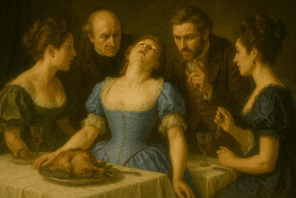 E o que não faltava eram escândalos: dizia-se que uma senhora que mostrasse o tornozelo cometia quase o mesmo pecado que Eva ao provar o fruto proibido. E sempre subia as escadas atrás de um cavalheiro, não por desvelo, mas por decoro — para que ele jamais vislumbrasse a curva do calcanhar. O pudor media-se em palmos de tecido, e a moral, em número de botões.
