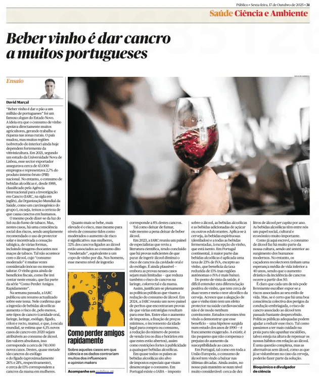 Há quem confunda divulgar ciência com a missão de nos salvar de nós próprios. Quando isso acontece, o rigor cede à retórica e o discurso científico transforma-se em catequese pública. O recente ensaio de David Marçal no Público, intitulado “Beber vinho é dar cancro a muitos portugueses”, é exemplo cristalino dessa deriva: uma peça em que o pânico se sobrepõe à ponderação, e a convicção ideológica suplanta a nuance científica.