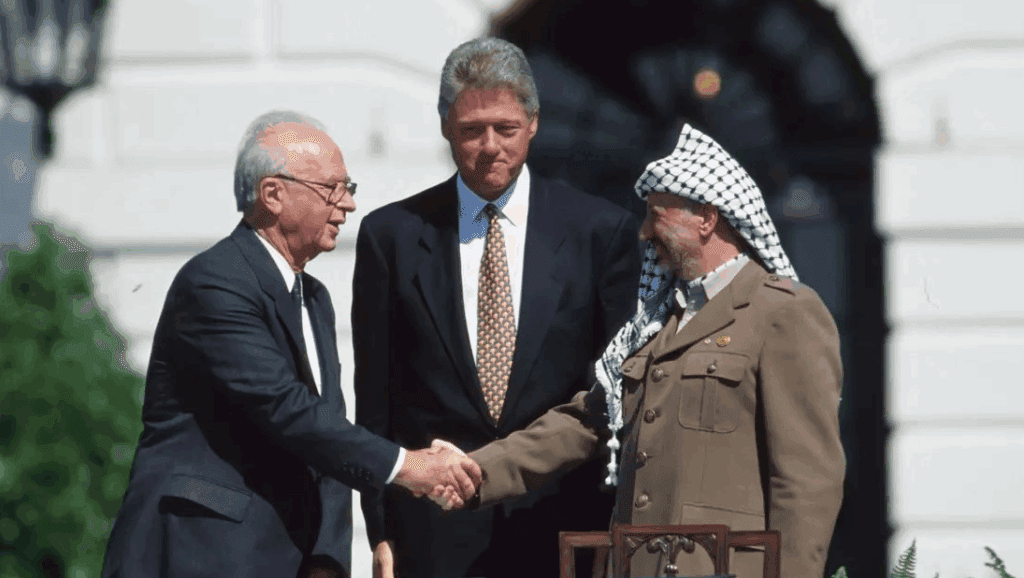 Esse caminho culminou em 1993, com os Acordos de Oslo. Apresentados ao mundo como um “histórico aperto de mão” entre Yitzhak Rabin e Yasser Arafat, prometeram um processo de paz, a criação de uma Autoridade Palestiniana e a perspectiva de um futuro Estado palestiniano – essa organização criminosa que sempre é proposta como solução para toda e qualquer salvação.