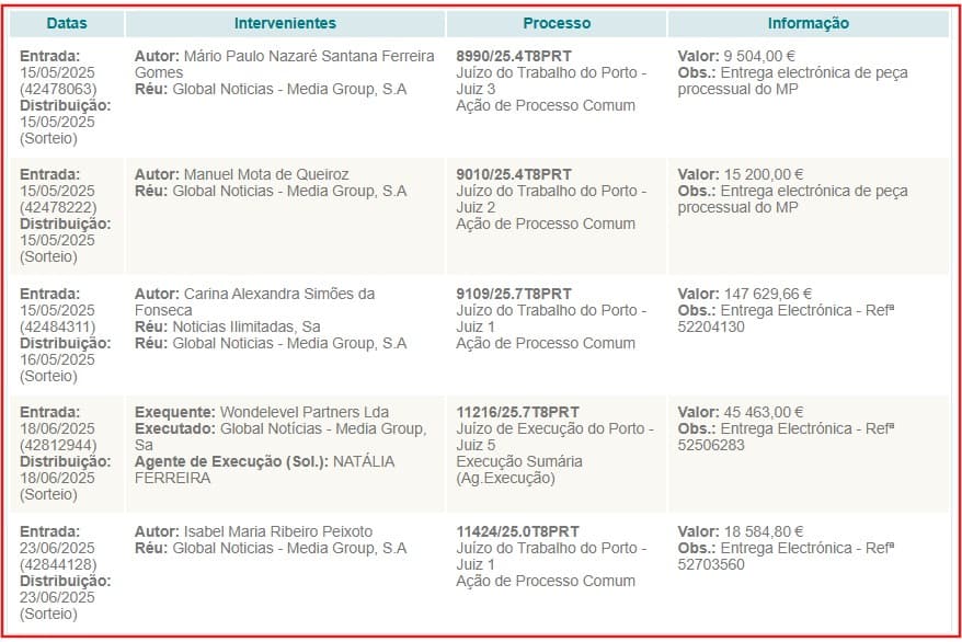 Este mês, o primeiro processo, deu entrada a 7 de Outubro, e é relativo a uma dívida no valor de 9.921,24 euros da Global Notícias a João Manuel Rodrigues da Silva, que foi designer na empresa entre Novembro de 1996 e Maio de 2024. ↓