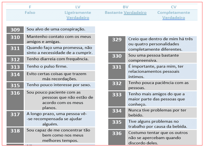 Há igualmente uma vertente quase caricatural na tentativa de detectar impulsividade ou descontrolo emocional, com itens como “Às vezes, expludo e perco o controlo sobre mim”, “Quando me enfureço, é muito difícil acalmar-me”, “Faço muitas coisas perigosas só pela emoção que me causam” ou “Quando estou a conduzir e me indigno com os outros condutores, faço para que deem conta disso”. E não faltam formulações de tom paranóide ou delirante, como “Algumas pessoas fazem coisas para me deixar mal”, “As pessoas que me rodeiam são leais comigo”, “Às vezes, misturo os pensamentos uns com os outros” ou “Certas partes do meu corpo ficaram sem sensibilidade, sem que eu saiba o porquê”.